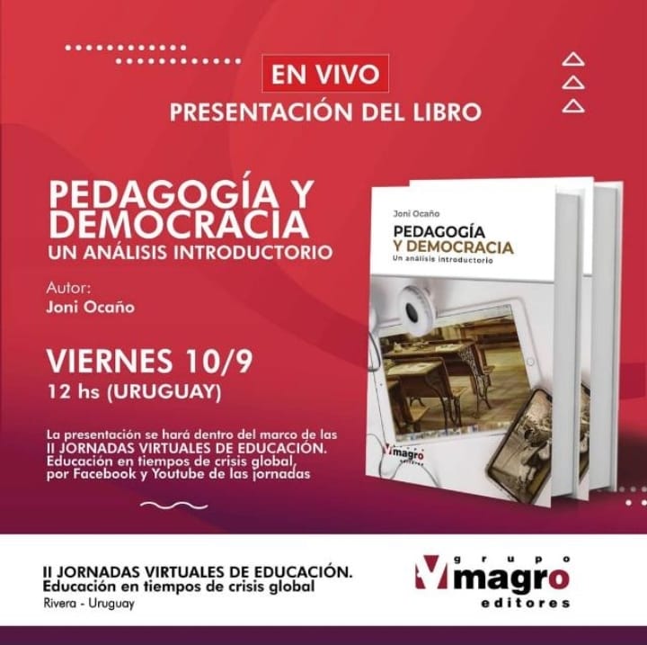 Se invita a todos los interesados a la presentación en vivo del libro "Pedagogía y Democracia" del Prof. Joni Ocaño en el marco de las II Jornadas Virtuales de Educación"